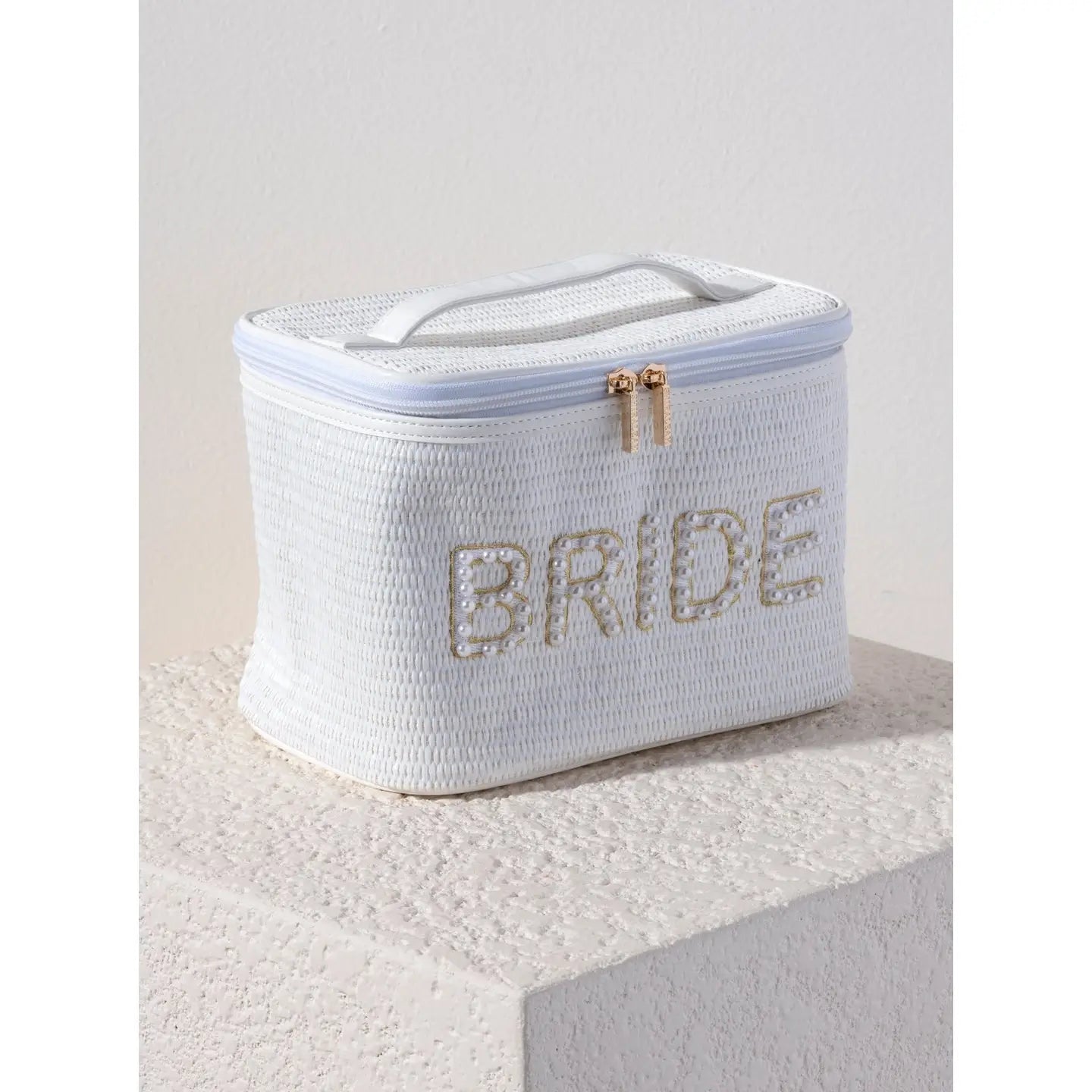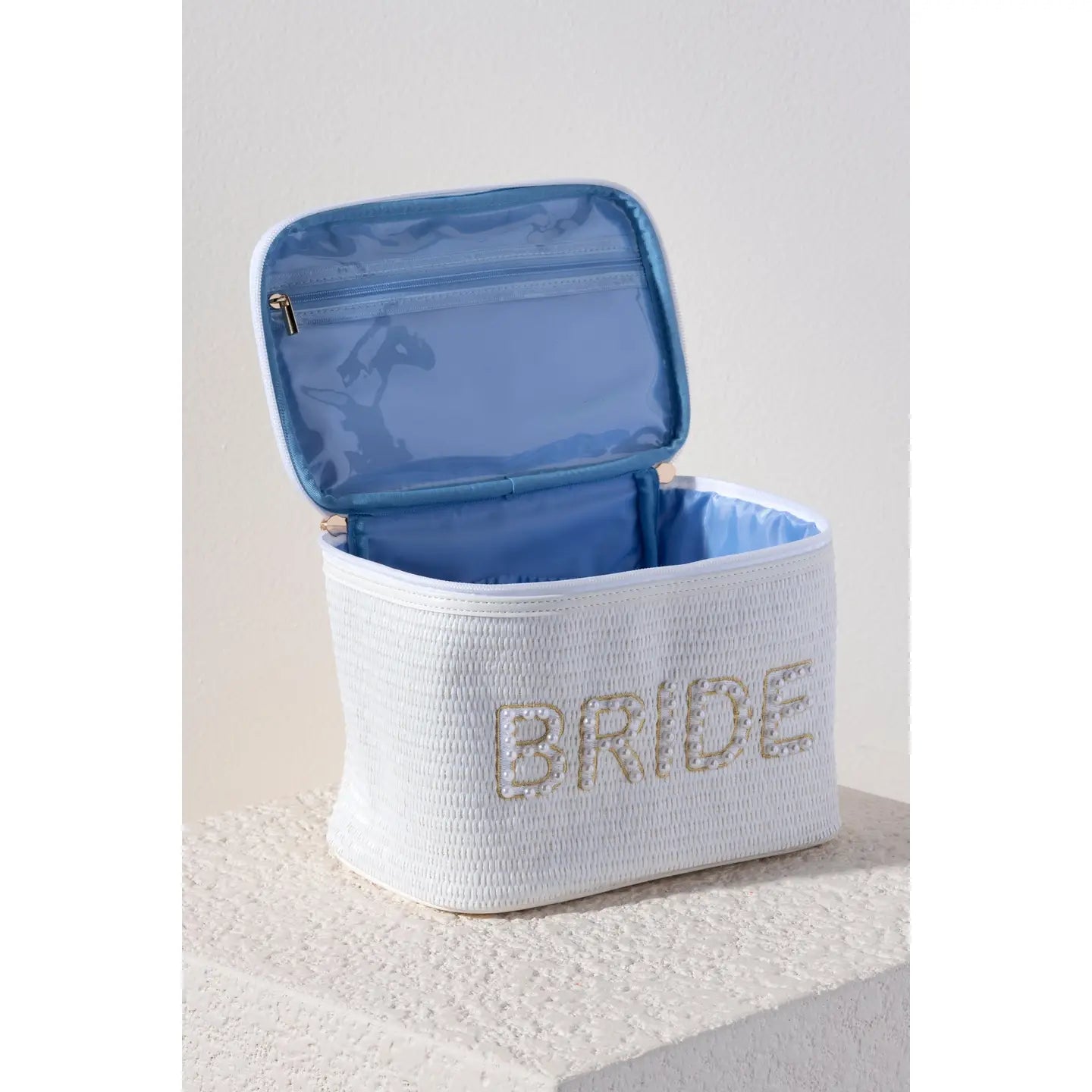 Carry your bridal beauty essentials in style with this charming white train case cosmetic bag. Featuring bold "BRIDE" lettering that celebrates your big moment, this spacious organizer keeps makeup, skincare, and accessories neatly arranged and easy to access. Perfect for getting ready on your wedding day or as a memorable keepsake gift for the bride-to-be!