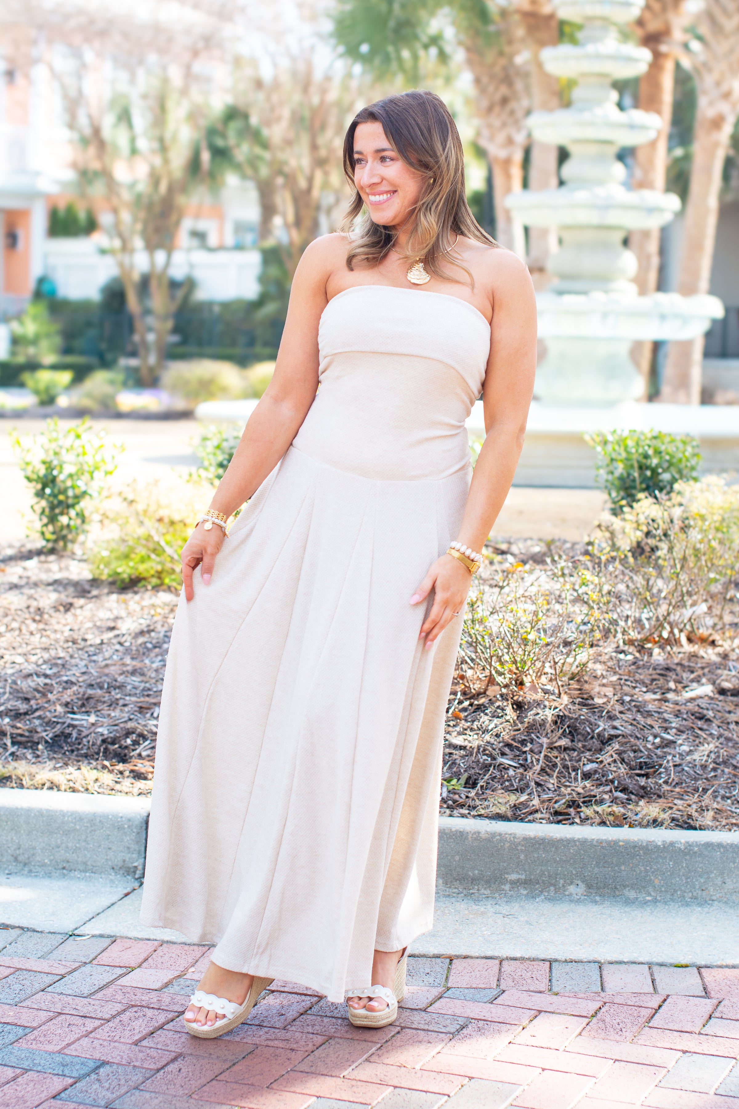 Meet the Astrid Dress—your new favorite for those moments when you want to feel absolutely stunning. Crafted in a gorgeous beige hue, this strapless maxi dress combines timeless elegance with quality construction that'll have you reaching for it again and again. Whether you're heading to a night out, or just want to feel polished and put-together, this dress delivers effortless sophistication with a playful edge.