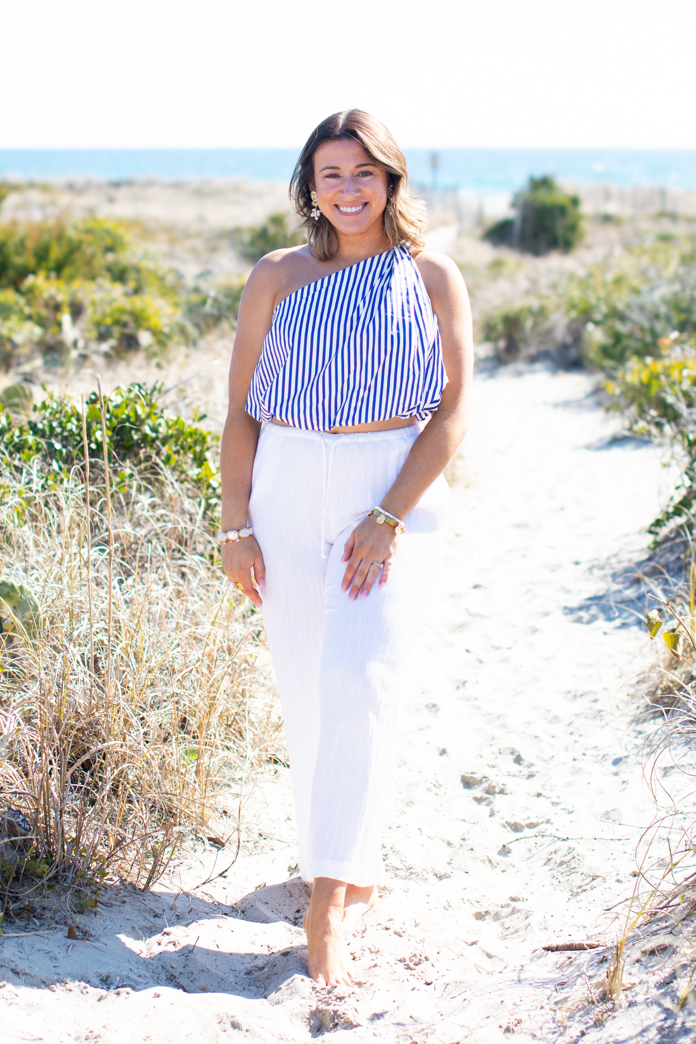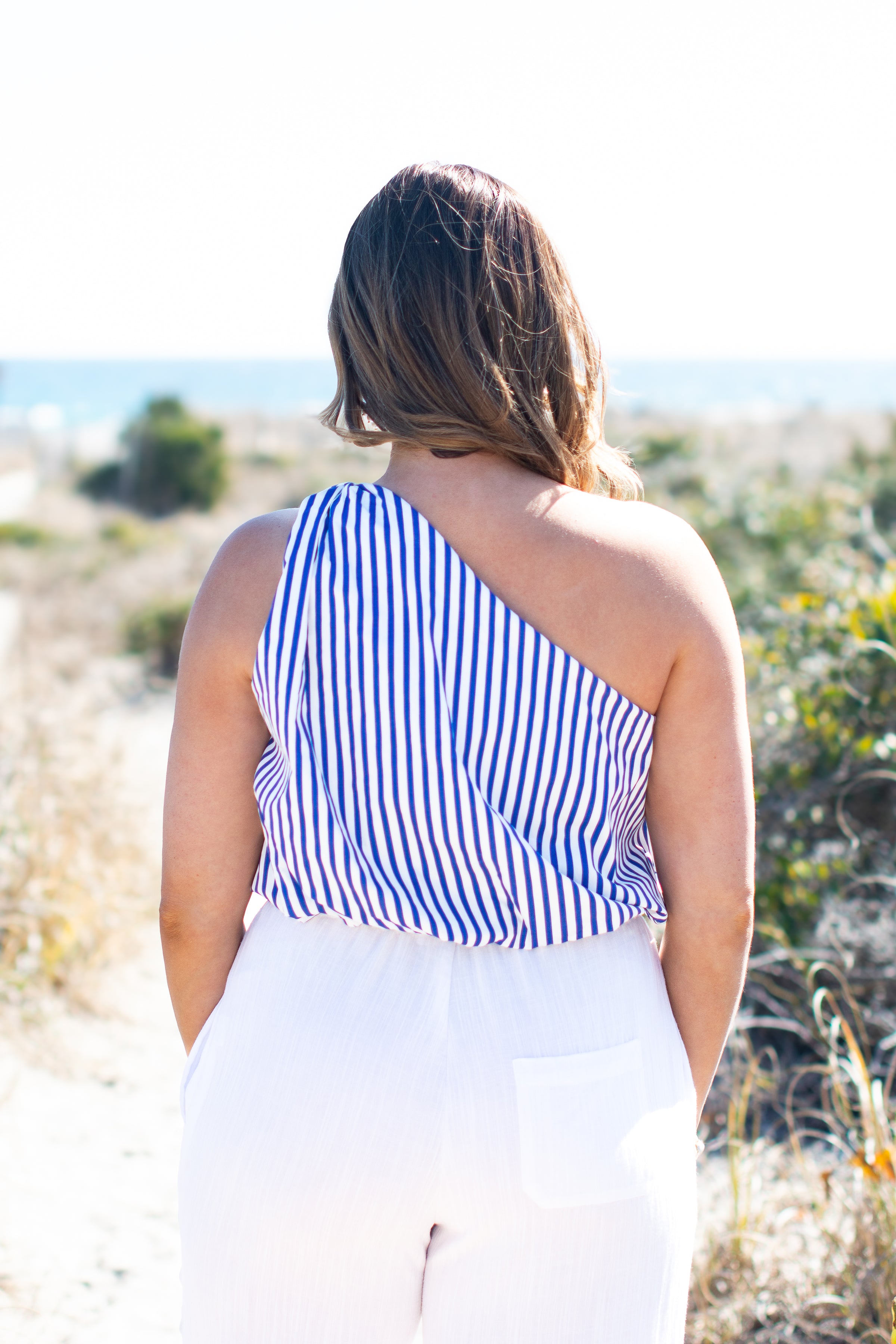 Dive into coastal charm with this playful striped crop top that's all about fun and flirtation. The royal blue stripes pop against a crisp backdrop, while the one-shoulder design adds just the right amount of sass. Bubble sleeves give it that breezy, beachy vibe you've been craving—perfect for summer adventures, seaside hangs, or whenever you want to feel like you're on permanent vacation.