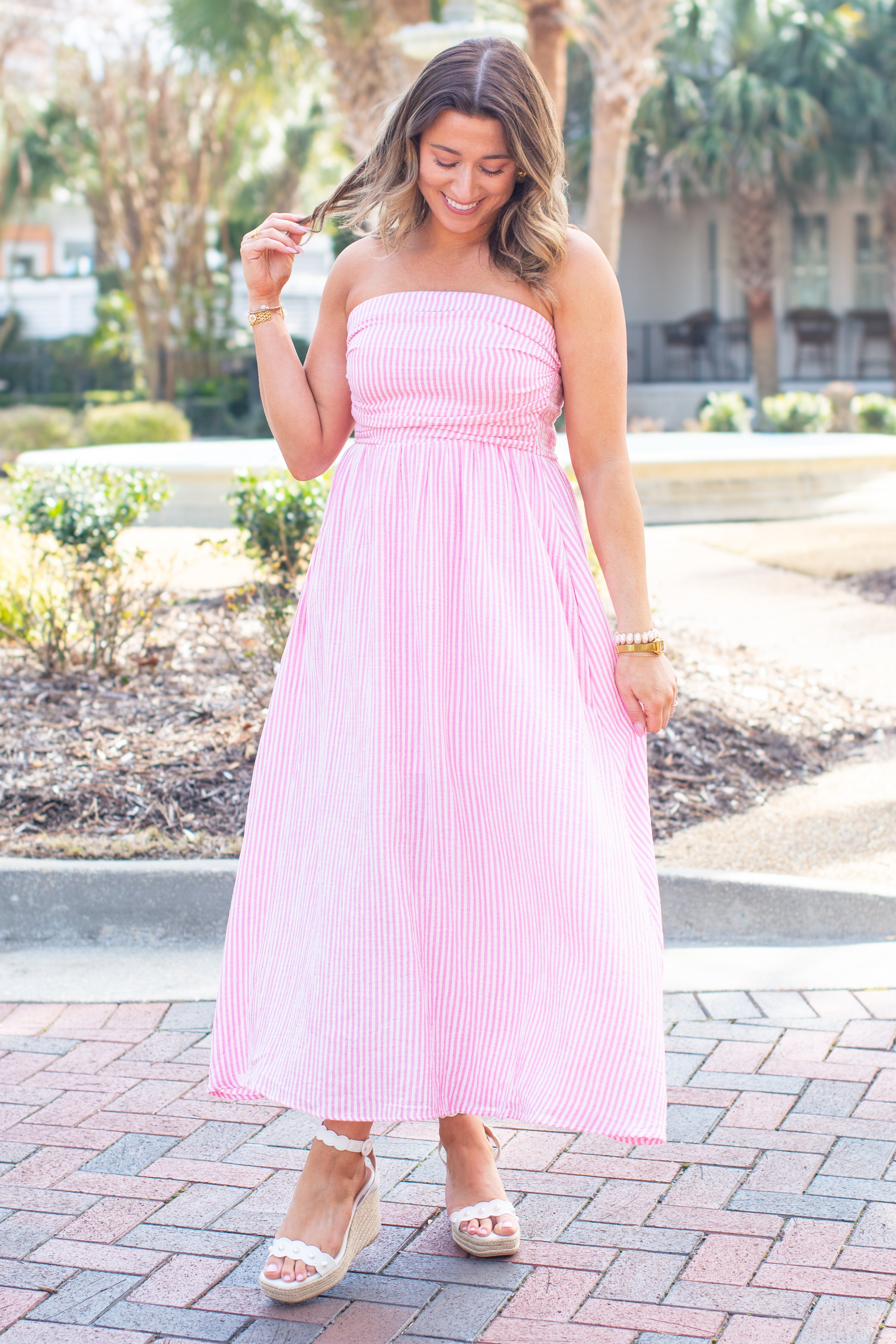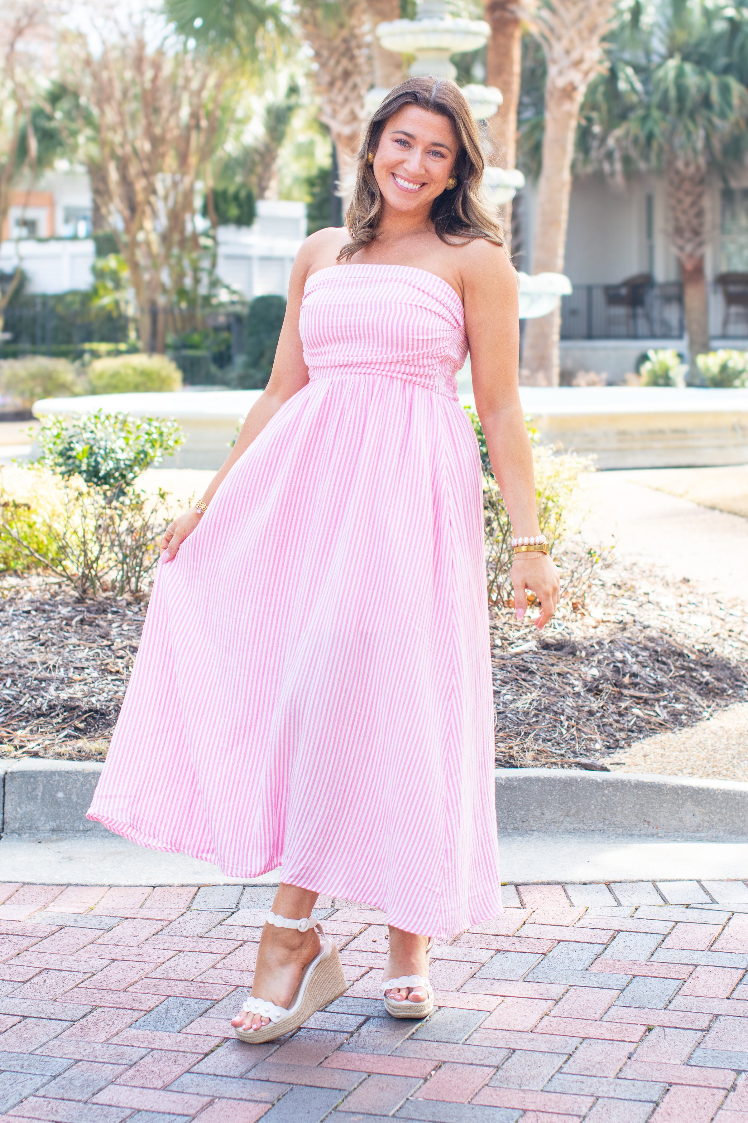 Meet your new spring essential—a stunning strapless midi dress in soft pink seersucker stripes that's ready for every sunny occasion. The textured fabric adds dimension while the classic striped pattern keeps things fresh and timeless. Slip it on for brunch dates, garden parties, or lazy afternoons when you want to look polished without trying too hard. This breezy silhouette flatters every figure and pairs beautifully with sandals, sneakers, or dressy heels.