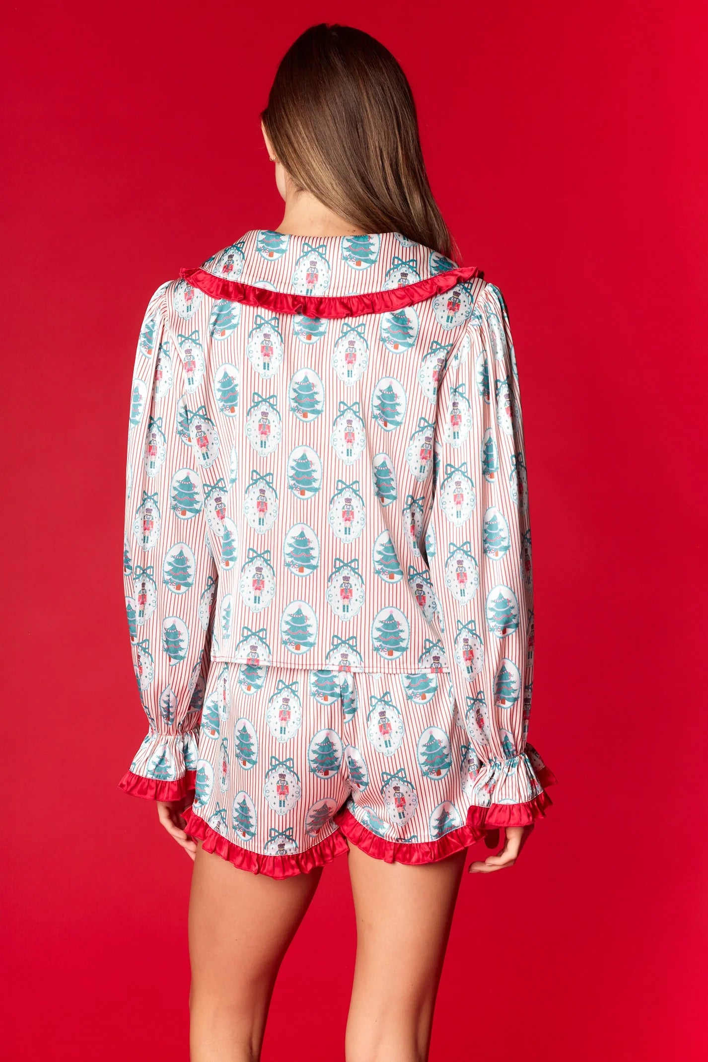 Get into the holiday spirit with this delightful red striped pajama set that's as fun as it is fabulous. The silky satin top features a charming Peter Pan collar and playful red ribbon closure, while whimsical nutcracker and tree patterns bring festive cheer to every wear. Paired with matching shorts, this set is your ticket to cozy Christmas nights filled with style and joy.
