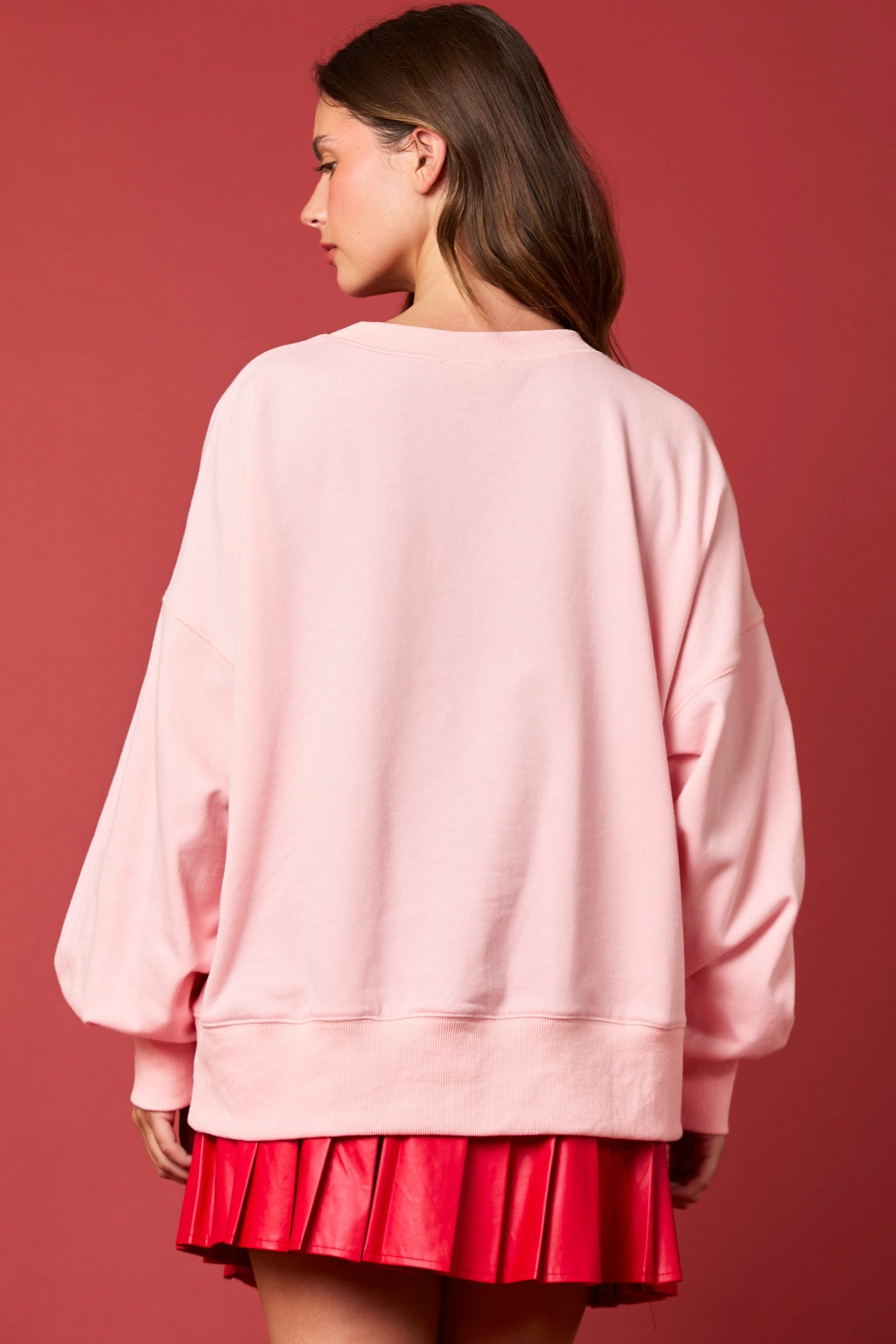 Embrace festive elegance with this oversized crewneck in soft baby pink. Adorned with a charming Santa sequin and fur patch, it effortlessly blends holiday spirit with contemporary style. Perfect for cozy gatherings or casual winter days, this piece delivers comfort without compromising on sophistication.