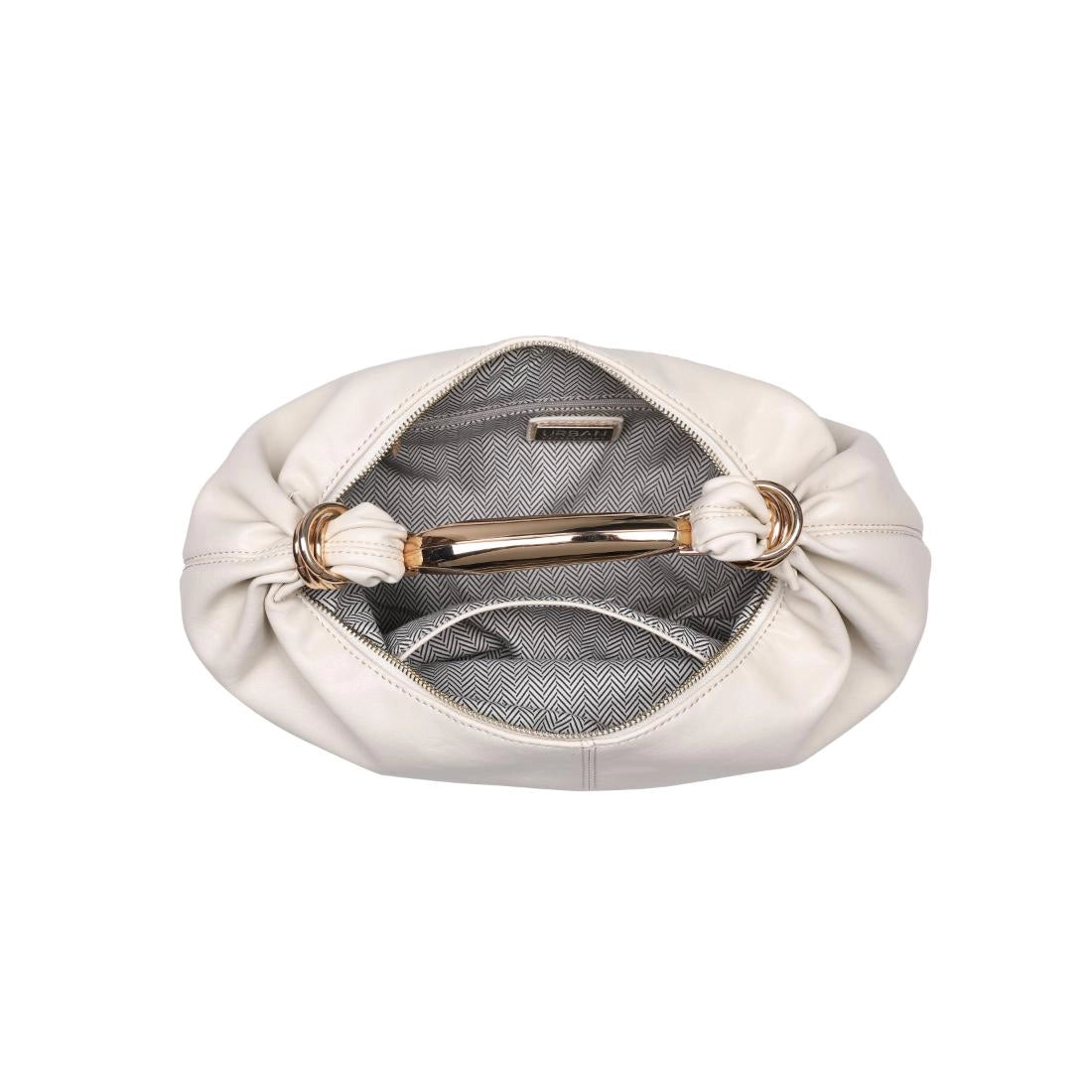 Exterior Details: Vegan Leather, Circular Shape, Pull Zipper Tabs, Gold Asymmetrical Handle