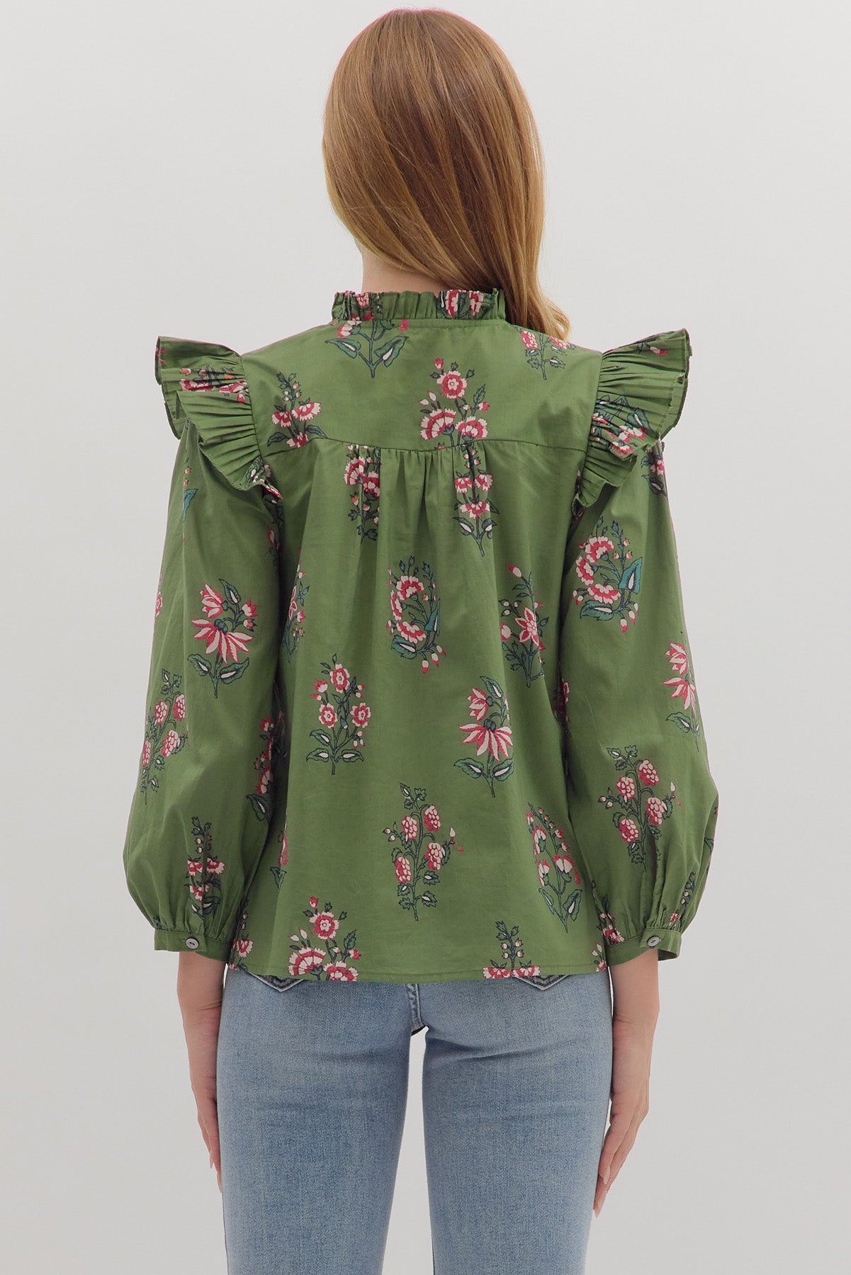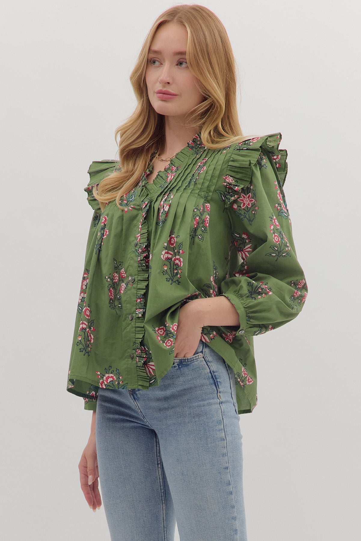 The Candice Top brings effortless elegance with its soft cotton construction and charming design. Featuring a rich green base adorned with delicate pink florals, this long-sleeved piece offers timeless appeal.