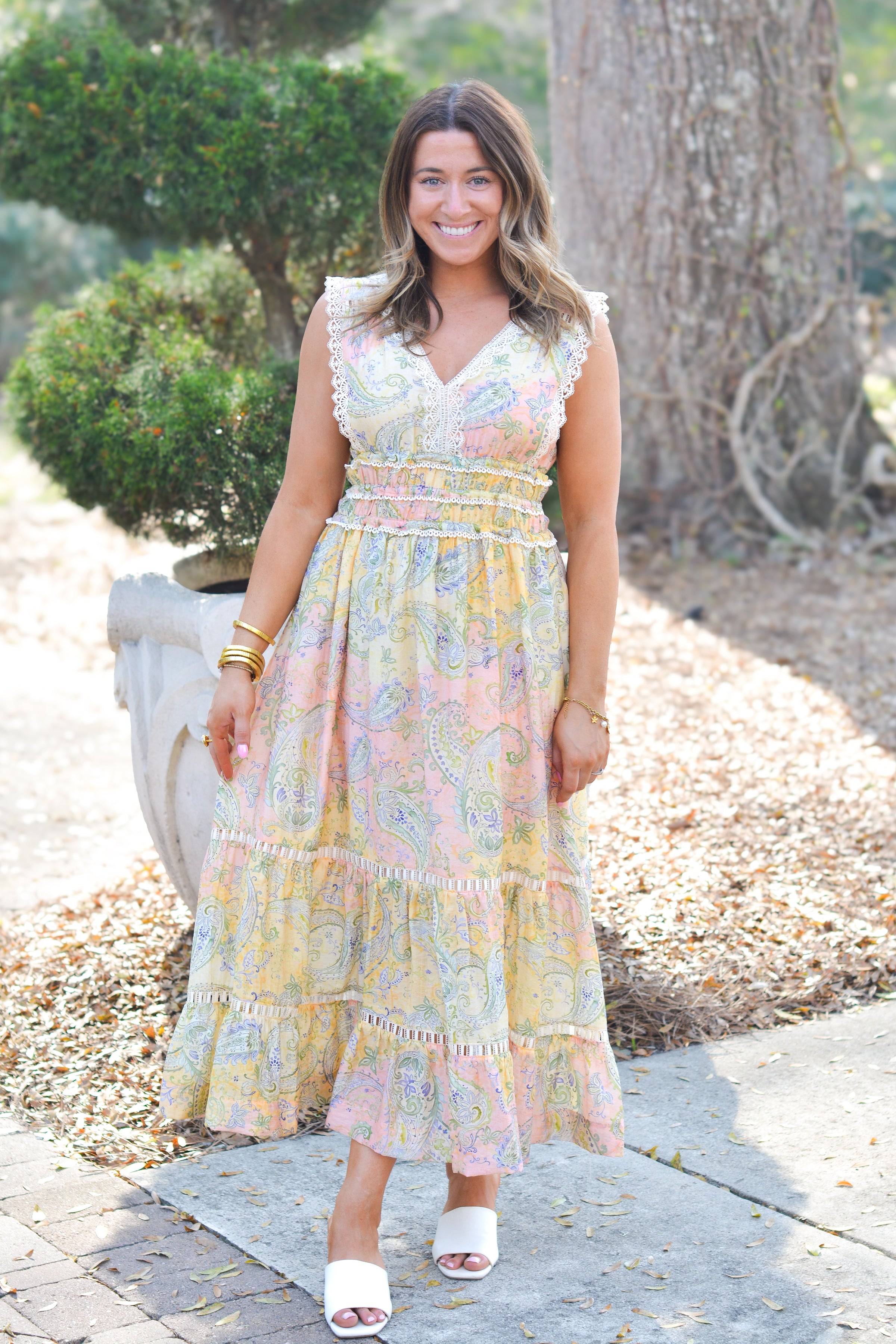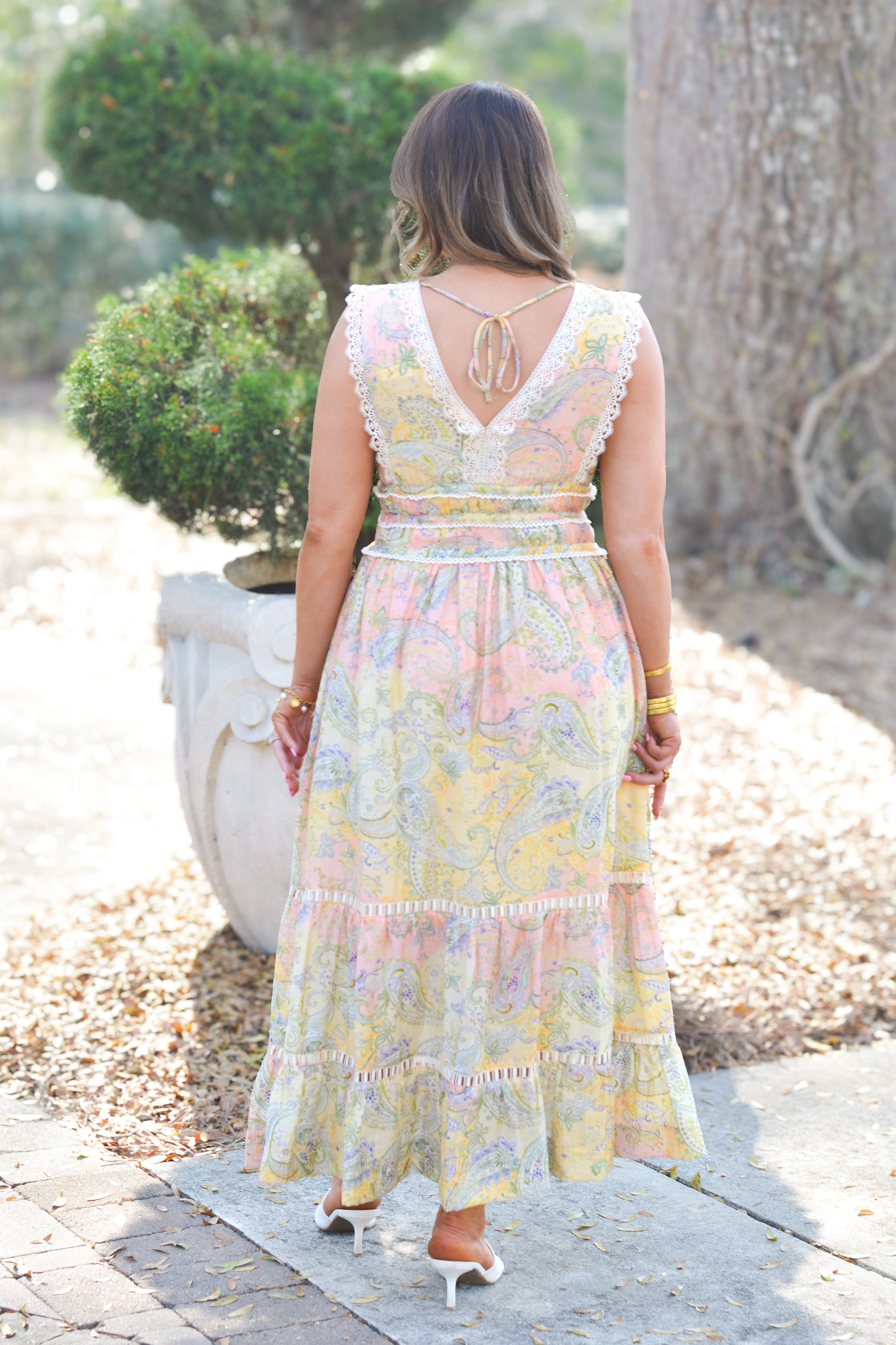 The Carmen Dress features a printed paisley design complemented by delicate lace trim, crafted in a flowing maxi silhouette. The use of pastel colors contributes to a soft, aesthetic appeal, making it suitable for various occasions while ensuring comfort and elegance in one garment.