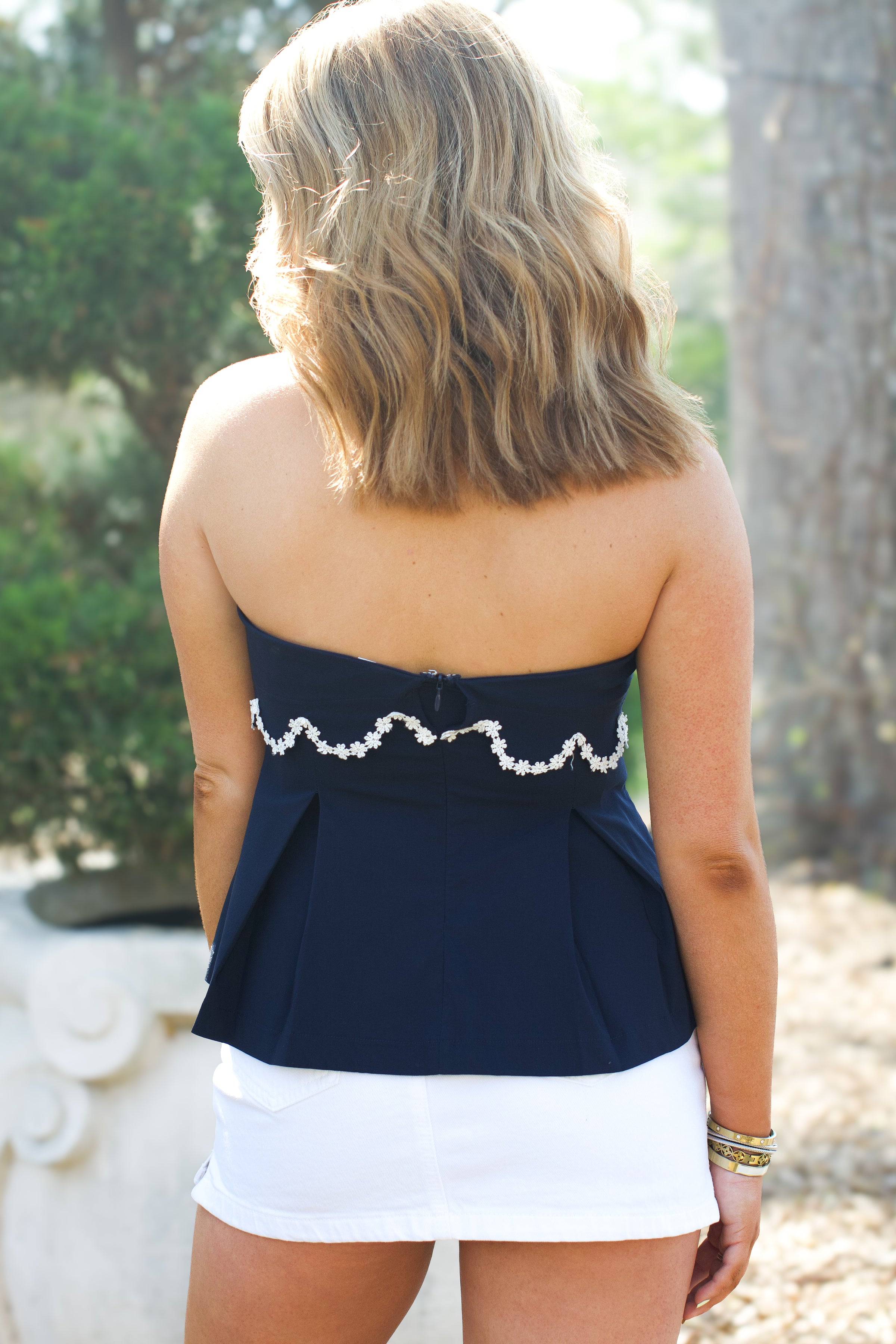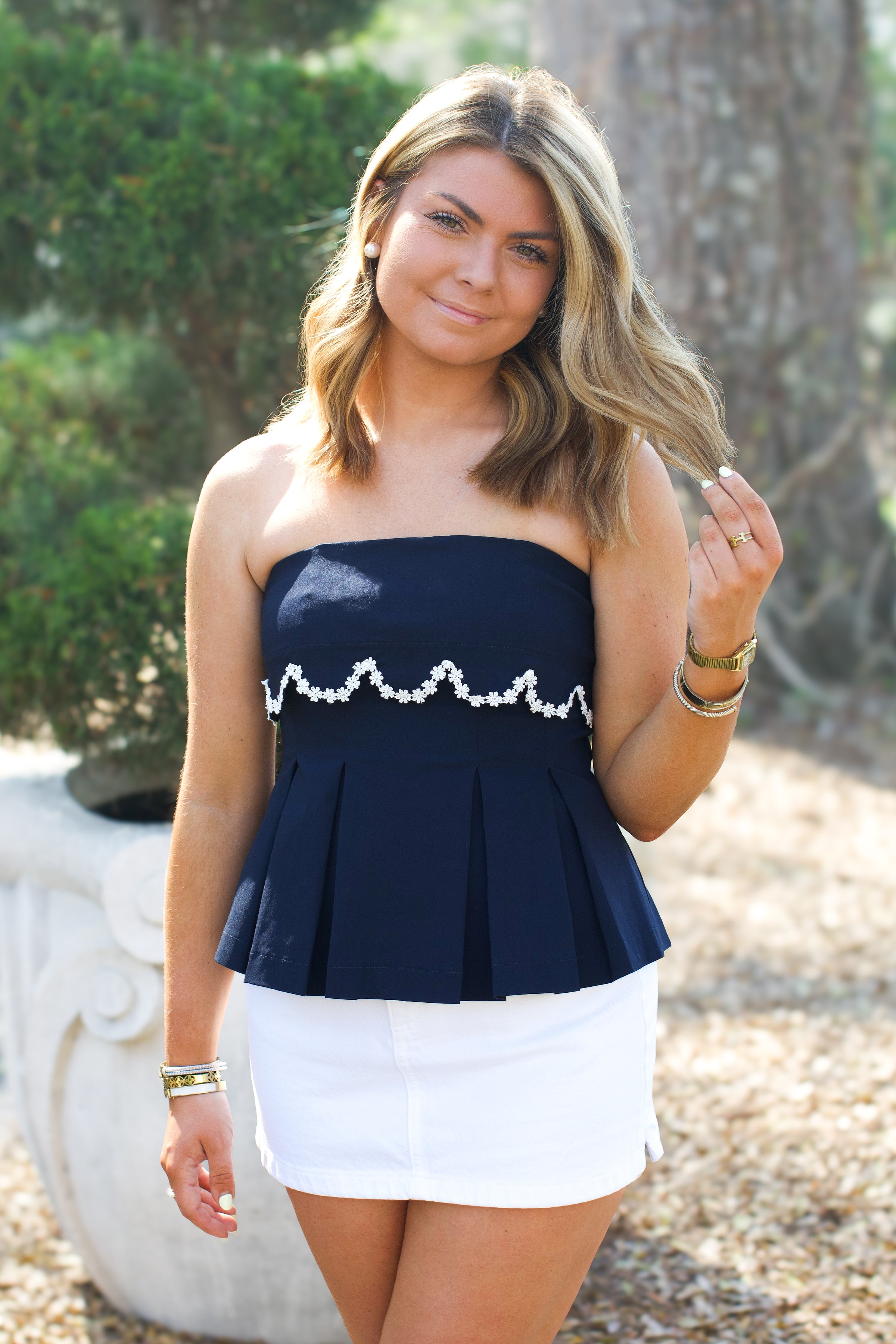 The Lawton Top is a sophisticated navy strapless piece featuring a flattering pleated bodice that creates elegant dimension. Delicate daisy trim detailing adds a charming feminine touch to this versatile wardrobe essential. Perfect for dressing up or down, this top pairs effortlessly with skirts, pants, or jeans for endless styling possibilities.