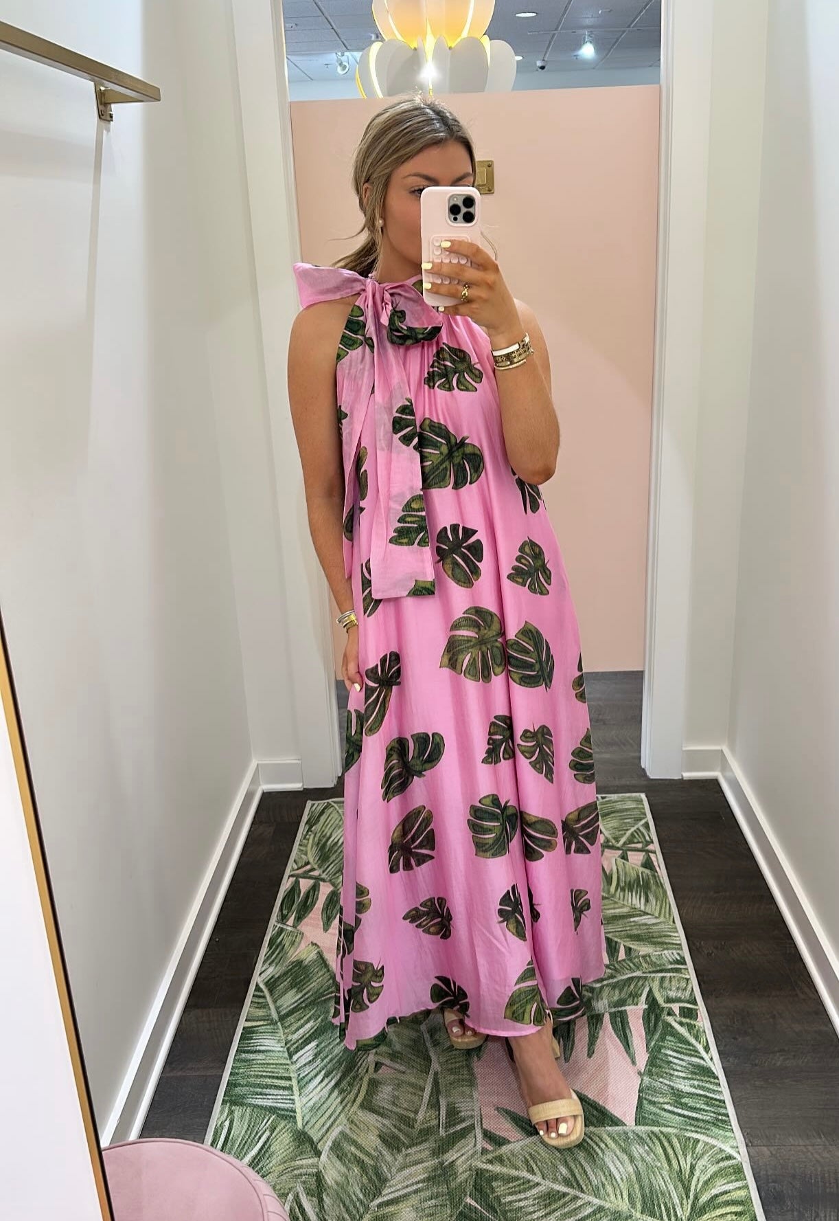 Escape to paradise in the Palm Villa Dress, a stunning pink maxi featuring lush green palm leaf prints. The elegant halter neck with decorative bow sash creates a flattering silhouette, while the flowing fabric moves beautifully with every step. Perfect for beach getaways, tropical vacations, or any occasion calling for effortless coastal style. Embrace the breezy, carefree vibe of island living.