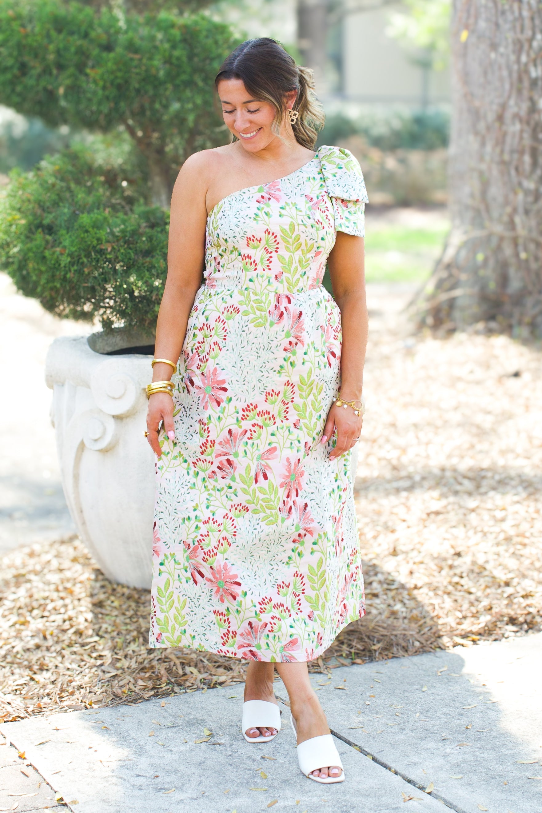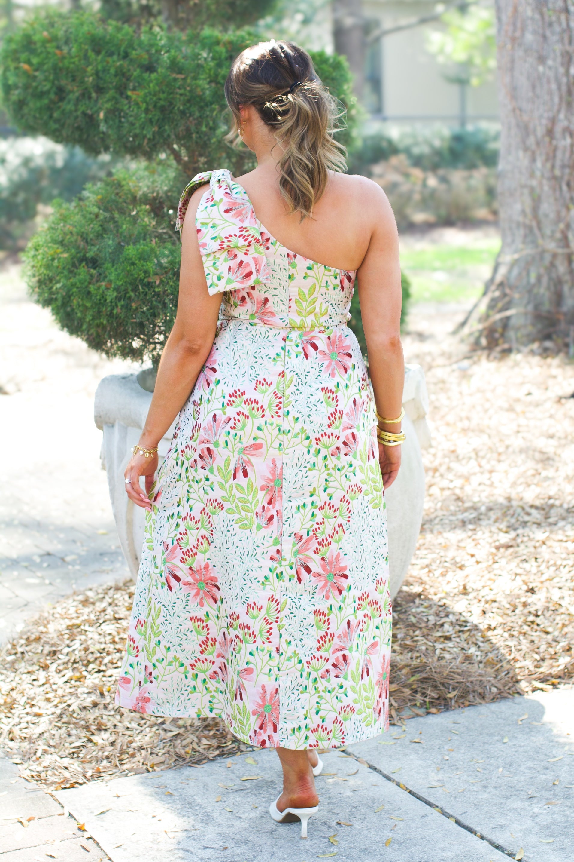 Make a striking entrance in the Petal Waltz Dress, a sophisticated one-shoulder midi featuring a romantic floral pink palette. The dramatic shoulder bow adds an unexpected touch of elegance, transforming this piece into an instant statement. Perfect for special occasions, garden parties, or anyone seeking a dress that commands attention while maintaining graceful femininity. The midi length offers versatility and timeless appeal.