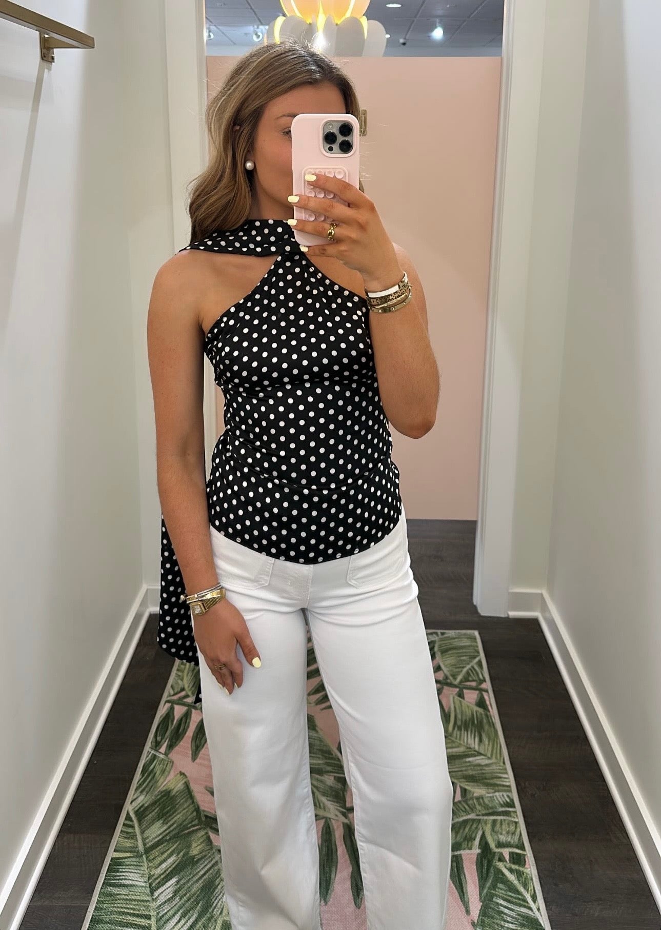 Effortlessly chic, the Veronica Top features a flattering halter neckline in classic black with crisp white polka dots. The standout sash scarf detail adds movement and sophistication, perfect for dressing up casual outfits! A versatile wardrobe essential that transitions seamlessly from day to night.